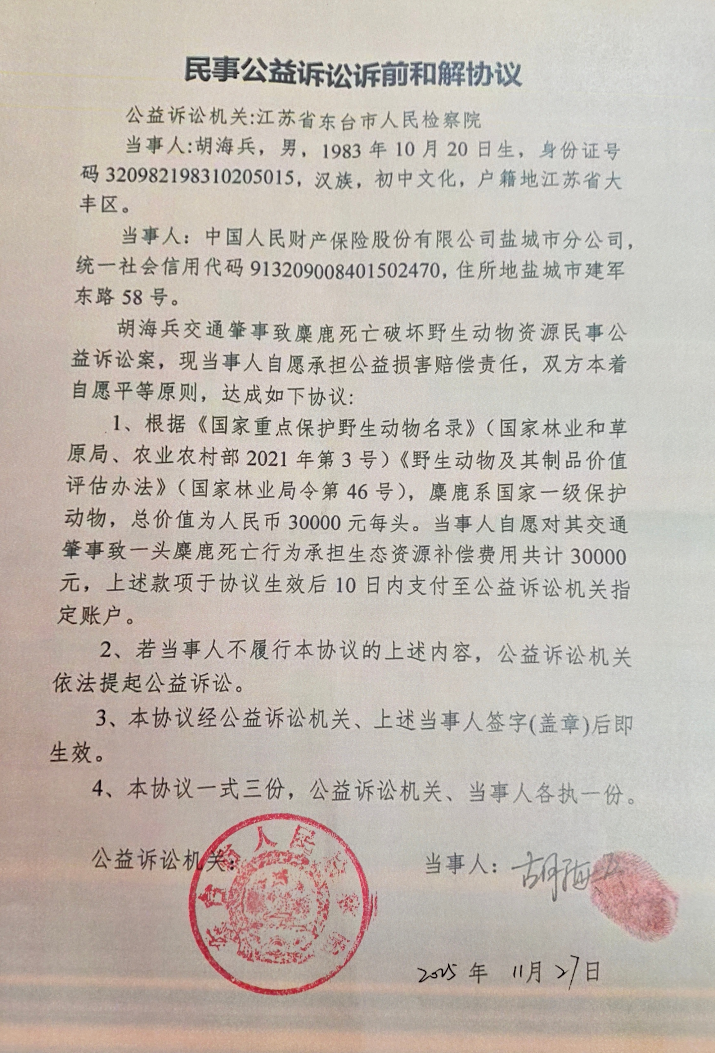 胡海兵交通肇事致麋鹿死亡破坏野生动物资源民事公益诉讼案,现当事人自愿承担公益损害赔偿责任,双方本着自愿平等原则,达成如下协议: