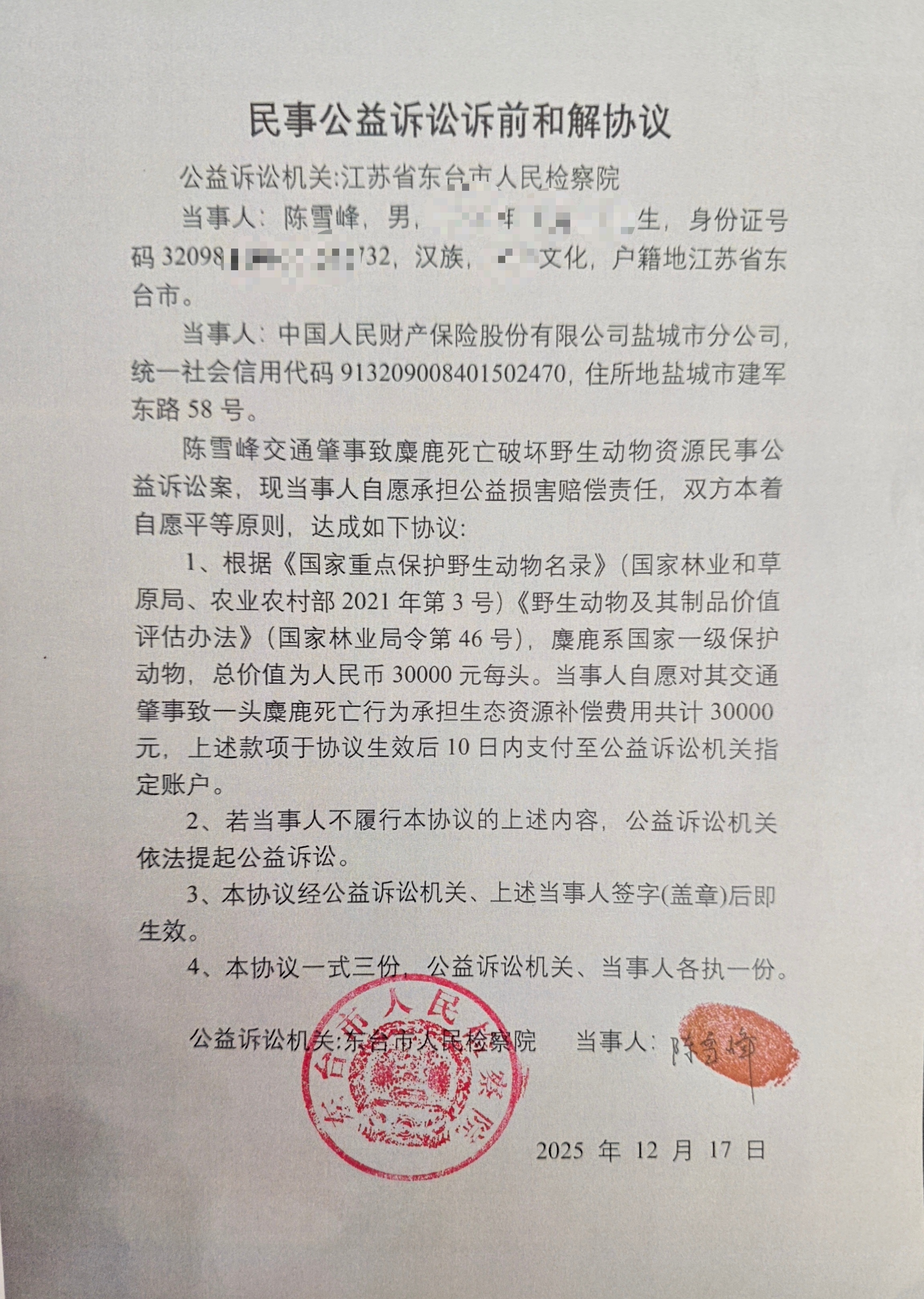 陈雪峰交通肇事致麋鹿死亡破坏野生动物资源民事公益诉讼案,现当事人自愿承担公益损害赔偿责任,双方本着自愿平等原则,达成如下协议: