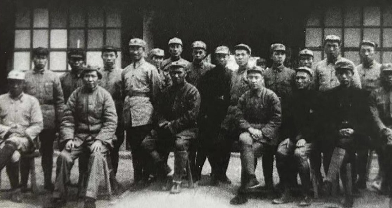 1937年1月,中国人民抗日红军大学迁至延安,并改名为中国人民抗日军事政治大学,毛泽东(坐者左2)、朱德(坐者左3)、林彪(坐者左4)与抗大部分领导合影。